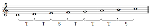 La Escala Mayor, también conocida como el Modo Jónico, está formada por un patrón de dos tonos, un semitono, tres tonos y un semitono. A continuación la Escala Mayor en la tonalidad de Do:
