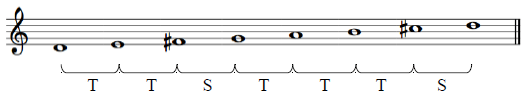 Cuando transportamos la escala mayor a otras tonalidades, su estructura de tonos y semitonos (medios tonos) se conserva.  Por ejemplo, la escala mayor en la tonalidad de re quedaría así: