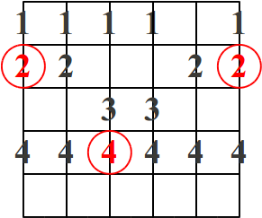 Los números en rojo circulados representan la nota raíz o tónica de la escala.  En otras palabras, las ubicación de las notas rojas circuladas nos permiten saber en que tono estamos tocando.  Por ejemplo, si ubico el primer patrón de forma tal que la nota roja circulada de la quinta cuerda quede en el quinto espacio, estaré tocando en re mayor.  Si no conoces las notas en la guitarra, descarga el siguiente diagrama en formato pdf, el cual te servirá de referencia:
