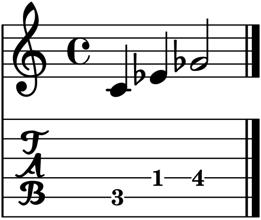 Finalmente, veamos las digitaciones tipo C, en las cuales ejecutamos dos notas en la primera cuerda y una nota en la próxima cuerda adyacente. La siguiente digitación nos sirve para ejecutar triadas disminuidas empezando en la sexta, quinta, cuarta y segunda cuerda: